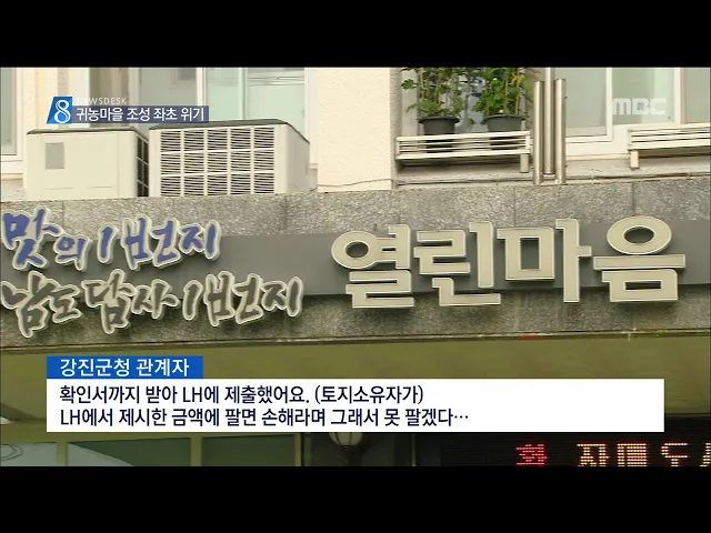 ◀ANC▶ 강진군이 야심차게 추진했던 백억 원대 귀농귀촌 마을 조성사업이 착공도 못한채 좌초 위기에 놓였습니다. 토지소유자의 확약서만 믿고 추진했다가 빚어진 일입니다. 문연철 기자입니다. ◀END▶ ◀VCR▶ 월출산 자락인 강진군 성전면 월남마을입니다. 강진군은 지난해 1월 이 곳 3만여㎡에 150억 원을 투자해 6...