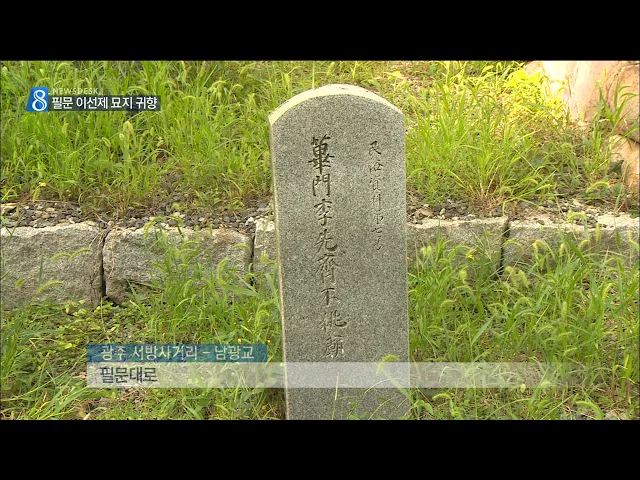 (앵커) ◀ANC▶ 시청자 여러분 '필문 대로'를 아십니까 광주 서방사거리부터 남광교에 이르는 길인데 조선시대에 광주를 군에서 목으로 승격시킨 필문 이선제 선생을 기린 이름입니다. 그런데 해외로 밀반출된 필문의 묘지가 전라도 천년을 앞두고 극적으로 반환됐습니다. 이미지 뉴스리포터입니다 ◀VCR▶ 서방사거리부...