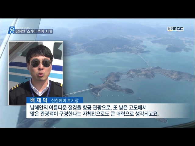 ◀ANC▶ 소형 항공기를 타고 남해안 관광지를 둘러보는 '스카이 투어'가 이번 주말 여수에서 시작됩니다. 새로운 관광 컨텐츠가 시험대에 오른 셈인데요. 김종태 기자가 투어 현장을 미리 다녀왔습니다. ◀END▶ 10인승짜리 소형 항공기가 활주로를 박차고 공중으로 떠오릅니다. 이륙한지 1분만에 아득하게 멀어진 땅 푸...