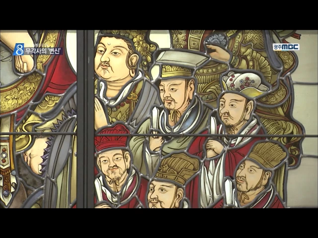 (앵커) ◀ANC▶ 스테인드글라스 하면 보통 성당이나 교회 유리창이 쉽게 떠오르죠.. 그런데 국내에서는 처음으로 이 기법이 광주의 한 사찰에서 사용돼 눈길을 끌고 있습니다. 이미지 뉴스리포터입니다. (리포터) ◀VCR▶ 가로 8미터, 세로 2.5미터의 커다란 아크릴화가 무각사 설법전에 걸렸습니다. 캐릭터 같기도 하고 ...
