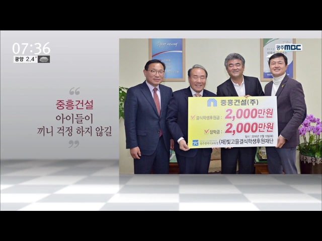 중흥건설이 저소득층 학생들의 끼니 걱정을 덜어주기 위해 빛고을 결식학생 후원재단에 후원금을 기부했습니다. (13) 광주 광산구 산정중학교 학생과 학부모가 직접 김장 김치를 담가, 어려운 이웃들에게 나눠주었습니다. (10) 서구 어린이 급식관리 지원센터가 크리스마스를 앞두고, 아이와 부모가 함께 검은 쌀로 케이크...