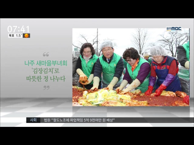 네팔에 들어설 두 번째 아시아 광주 진료소가 내년 초 개원을 앞두고 진료에 들어갔습니다.(30) 곡성군 새마을부녀회가 김장김치와 고추장을 직접 담가 이웃에게 전달했습니다. (28~30) 나주시 새마을부녀회가 이웃들에게 선물하기 위해 김장 김치를 담갔습니다.(27~30) 동강대학교가 집이란 무엇이고, 미래 주택은 어떤 방...