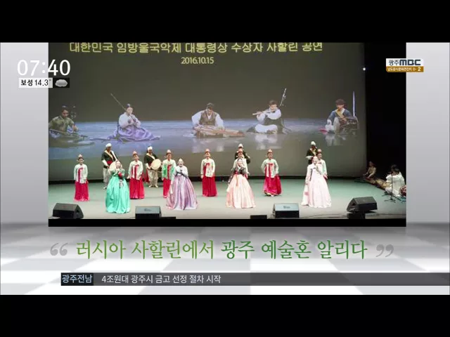 임방울 국악진흥회가 한*러 수교 26주년을 기념해 러시아 사할린 악짜브리극장에서 전통 국악 공연을 선보였습니다. (15) 청소년들이 음악과 노래로 하나되어 어울리는 동구 청소년 가요제가 광주 금남근린공원 야외무대에서 열렸습니다. (15) 광주 광산구 어룡동 주민자치위원회가 용아 박용철 선생의 자취와 마을 유래를 ...