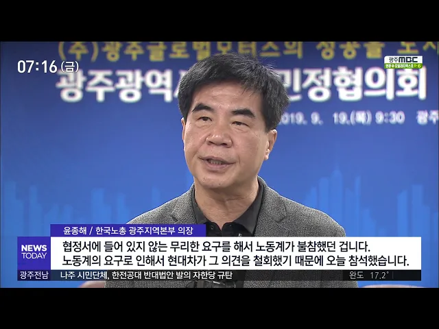 (앵커) 광주형 일자리 합작법인 설립 절차가 이번 주 안에 마무리될 것 같습니다. 법인 설립을 최종 합의하기 위한 노사정 협의회가 현대차와 노동계의 이견으로 무산 직전까지 치닫다 가까스로 고비를 넘겼습니다. 송정근 기자입니다. (기자) 광주형 일자리 자동차공장 합작법인의 최종 합의를 위한 노사민정 협의회가 지...