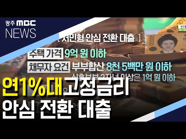 ◀ANC▶ 이자율이 하락하면서 대출 이자 부담이 높으신 분들은 갈아타볼까 하는 고민을 한 번쯤은 해보셨을 텐데요. 정부가 서민들의 이자 부담을 줄이기 위해 연 1%대의 고정금리로 갈아탈 수 있는 안심 전환대출을 실시하기로 했습니다. 요건은 어떻게 되는지 이재원 기자가 전해드립니다. ◀END▶ ◀VCR▶ (C.G)---- ...