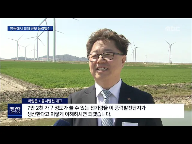 (앵커) 국내 최대 규모의 풍력발전단지가 영광 해안가에 세워졌습니다. 전남이 의욕적으로 추진해온 신재생에너지 사업이 한단계 도약하는 기회가 될 것으로 기대됩니다. 이계상 기자.. (기자) 영광군 백수읍 해안가에서 대형 풍력발전기가 쉼없이 돌아갑니다. 청보리가 자라고 있는 간척지를 따라 일정한 간격으로 발전 설...