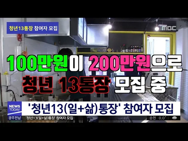 광주시가 청년 생활안정 지원 사업인 '청년13(일+삶)통장' 참여자를 모집합니다. 대상은 광주에 거주하는 만 19세부터 34세까지의 근로 청년으로 세금을 포함해 최근 3개월간 평균 근로소득이 61만 2천원 이상, 170만 7천원 이하면 신청이 가능합니다. 신청은 오는 25일부터 닷새 동안 광주시청 1층 민원실에 하면 됩니다....