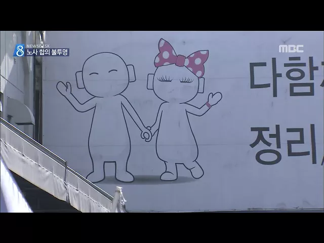 (앵커) 해외자본 인수설이 나오면서 금호타이어 노사가 오늘(26)까지 경영정상화 계획에 합의할 가능성이 사실상 희박해졌습니다. 채권단이 이미 노사 합의가 안되면 강력한 후속조치를 예고한 가운데 노조는 총파업도 마다하지 않겠다며 맞서고 있습니다. 정용욱 기자입니다. (기자) 큰 틀에서 합의를 이뤄가며 9부 능선을...
