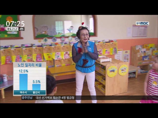 ◀ANC▶ 정부의 일자리 정책이 뜨거운 감자인 요즘, 여수의 노인 일자리 사업이 좋은 평가를 받고 있습니다. 그러나 일자리의 질적인 문제는 여전히 해결해야 할 과제로 꼽히고 있습니다. 채솔이 기자가 보도합니다. ◀END▶ ◀VCR▶ 손주뻘 되는 아이들과 동요를 부르며 율동 지도를 합니다. 어르신들의 일터인 이곳은 ...
