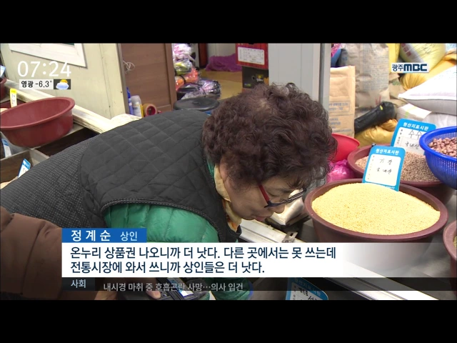 (앵커) 설 명절을 앞두고 전통시장에서 온누리 상품권을 이용하는 분들 계시죠.. 온누리 상품권 이용이 해마다 증가하면서 전통시장 활성화에 기여하고 있습니다. 박수인 기자입니다. (기자) 전통 시장을 자주 찾는 정춘자 씨.. 수년 전부터 전통 시장 상품권인 온누리 상품권으로 물건값을 지불하고 있습니다. 온누리 상품...