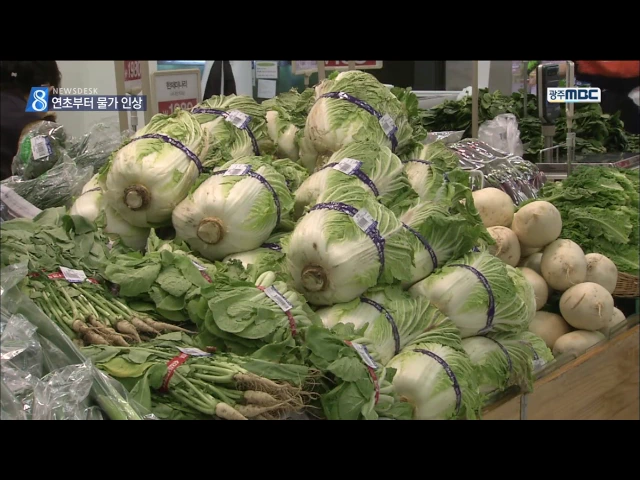 ◀ANC▶ 지난해 말부터 이어진 물가인상 조짐이 올초부터 심상치 않습니다. 무를 비롯한 채소류 값도 명절을 앞두고 지속적으로 오를 전망이어서 서민들의 지갑열기가 쉽지 않아 보입니다. 김종수 기자입니다. ◀VCR▶ 지난해 말, 라면과 맥주 등에 이어 새해에도 생필품 가격이 들썩이고 있습니다. AI여파로 인한 달걀값...