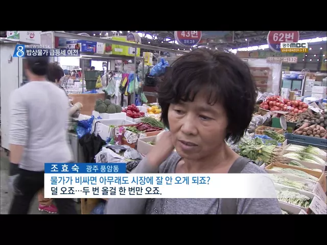 (앵커) 장바구니 물가의 고공행진이 좀처럼 꺾이질 않고 있습니다. 조사를 해 보니 야채나 채소값이 전체적으로 두 자릿수 상승했고, 많게는 100퍼센트 넘게 오른 품목도 있습니다. 주부들의 고민이 깊어지고 있습니다. 정용욱 기자입니다 (기자) 장을 보러 온 주부가 야채나 채소 등 반찬거리를 선뜻 고르지 못합니다. 농...