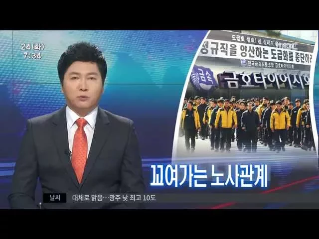 ◀앵 커▶ 근로자 분신 사망 사건으로 촉발된 금호 타이어의 노사 문제가 갈수록 꼬여가고 있습니다. 노조는 사측이 추진하고 있는 도급화가 직접적인 원인이라며 철회를 촉구하고 있고, 사측은 도급화와는 관련이 없다고 선을 긋고 있습니다. 이재원 기잡니다. 지난 16일 밤 스스로 목숨을 끊은 고 김재기씨의 분신 원인을 ...