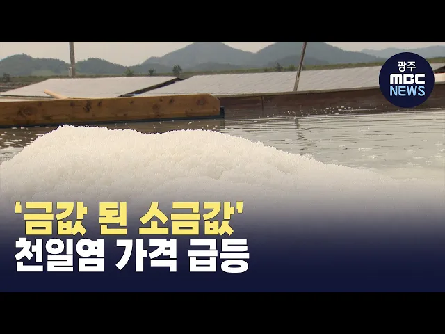 (앵커) 바닷물을 증발해서 만드는 천일염의 산지 가격이 급등하고 있습니다. 올해 생산량이 크게 감소한데다 후쿠시마 오염수 방류문제 등으로 사재기 심리도 가격 상승에 한 몫을 하고 있습니다. 김 윤 기자가 취재했습니다. (기자) 갯벌 위에 넓게 펼쳐진 천일염전에서 소금 생산이 한창입니다. 생산된 소금은 수레에 실...