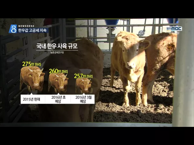 ◀ANC▶ 한우값 고공행진에 축산농민들이 즐거운 비명을 지르고 있습니다. 비싼 송아지 값에 사육 규모는 줄고 있어 한우값 강세는 계속될 전망입니다. 양현승 기자가 취재했습니다. ◀END▶ ◀VCR▶ 동이 트지 않은 새벽, 전남의 한 가축시장. 경매에 나온 소 울음소리로 가득 찼습니다. ◀SYN▶ "7시 15분까지 암소 ...