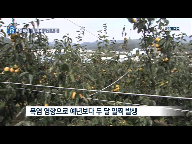 ◀ANC▶ 감 수확철을 맞았지만 농가들의 표정이 밝지만은 않습니다. 올여름 기록적인 폭염 탓에 팔지 못하고 버리는 감이 크게 늘었기 때문입니다. 문형철 기자입니다. ◀VCR▶ 제철을 맞아 수확을 앞둔 단감 농장. 가지에 달려있는 감 껍질에서 검은색 반점들이 발견됩니다. 강한 햇볕에 오랫동안 노출돼 과일이 타들어 ...