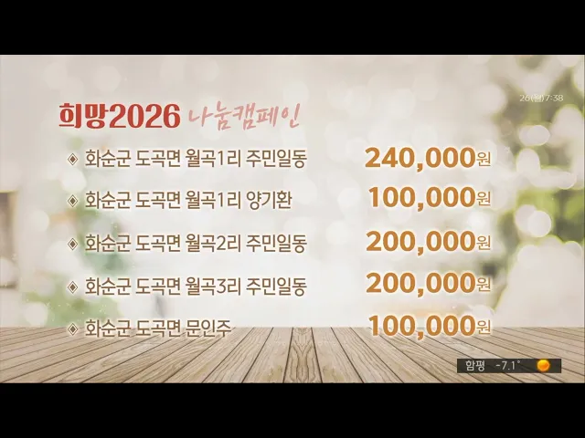 '희망 2026 나눔 캠페인'에 성금을 보내주신 분들입니다.'화순군 도곡면 덕곡1리 주민일동 150,000화순군 도곡면 덕곡2리 주민일동 150,000화순군 도곡면 대곡1리 주민일동 250,000화순군 도곡면 대곡2리 주민일동 200,000화순군 도곡면 대곡3리 주민일동 300,000화순군 도곡면 월곡1리 주민일동 240,000화순군 도곡면 월곡...