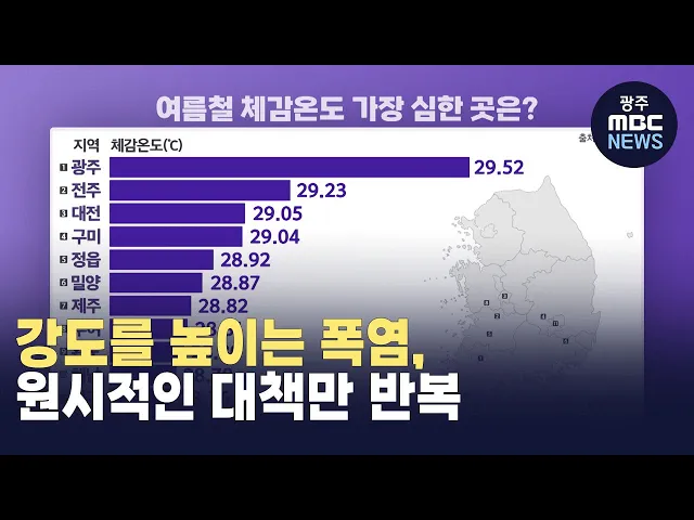 (앵커)올 여름 기록적인 폭염으로 많이 괴로우셨죠?아직도 기승을 부리고 있는데요.특히 광주 지역의 체감 온도가 전국에서 가장 높았다고 합니다.여기에 비해 광주시의 폭염 대책은사실상 원시적인 수준이라는게 전문가들의 진단인데요.무엇이 문제인지 광주MBC 시사용광로에서 짚어봤습니다.이재원 기자가 보도합니다. (...