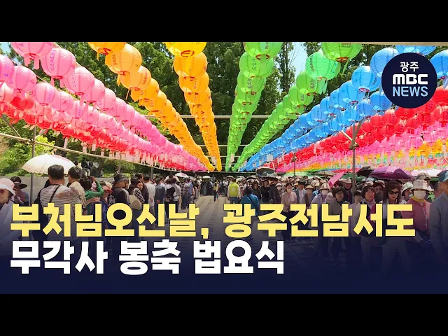 불기 2568년 부처님오신날인 오늘(15)광주전남 각 사찰에서도 봉축법요식이 열렸습니다.봉축법요식은 석가모니 탄생을 맞아 부처님의 가르침을 알리는 불교 최대 기념일로 광주 무각사에서 열린 이날 행사에는 청학 주지스님과 강기정 광주시장, 조인철 국회의원 당선인, 6천여명의 신도가 참석한 가운데 봉행 됐습니다. ...