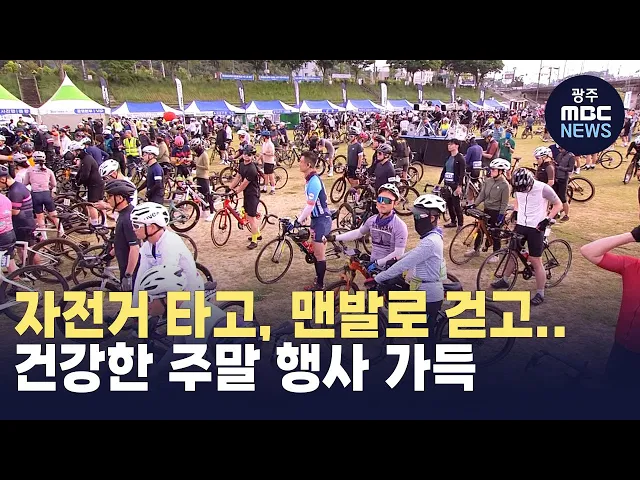 (앵커)주말을 맞아 지역 곳곳에서는다양한 행사가 열렸습니다.영산강을 바라보며 자전거를 타는 규모 있는 전국 단위 대회부터동네 숲길을 맨발로 걷는 축제까지.지인들과 함께 추억을 남기고,또 건강도 지키는 시간이었습니다.김초롱 기자가 다녀왔습니다. (기자)"5, 4, 3, 2, 1, 출발!"시작 신호가 울리자,선수들이 긴 대...