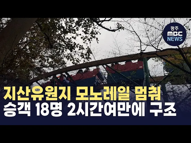 오늘(19) 오후 4시 20분쯤광주시 동구 지산동 지산유원지에서운행 중이던 모노레일이 멈춰섰습니다.이 사고로 부상자는 없었지만승객 18명이 119에 구조되기까지2시간여 동안 추위에 떨었습니다. 동구는 배터리 방전으로 모노레일이 멈춘 것으로 보고정확한 경위를 조사할 예정입니다.