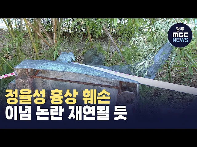 (앵커) 오늘 아침 광주 양림동에 세워진 정율성 흉상이 훼손된 채 발견됐습니다. 한 보수진영 전도사가 자신이 한 행위라고 유튜브를 통해 밝히기도 했는데 잦아드나 싶던 정율성 이념 논란이 재연될 것으로 보입니다. 김영창 기자가 보도합니다. (기자)광주 남구 양림동에 조성된 정율성 거리입니다. 단상에서 떨어진 정율...
