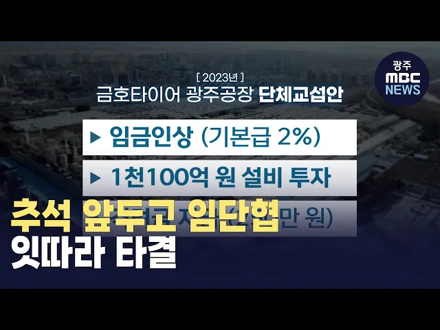 (앵커)금호타이어가 노사가 임금 인상과 시설 투자를 골자로 한 2023 임단협을 최종 확정지었습니다. 그동안 파행을 거듭했던 광주시립요양병원 노사들도 잇따라 협상안이 나오고 있습니다. 김영창 기자의 보도입니다. (기자) 해외공장 증설로 국내공장에 위기감이 들었던 금호타이어 광주공장. 여기에다 광주공장 이전마저...