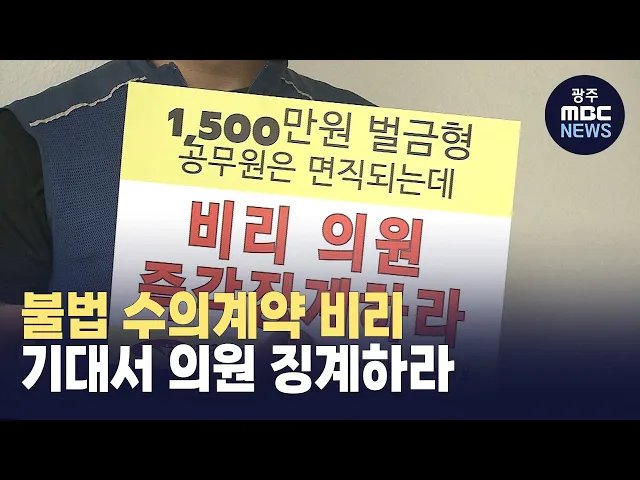 광주 북구 공무원 노조가 불법 수의 계약 비위로 벌금형 선고가 내려진 기대서 의원에 대해 징계 의결을 촉구했습니다. 전국공무원노동조합 광주본부 북구지부는 오늘(4) 본회의장 앞에서 손팻말 시위를 열고, 불법 수의 계약 비위로 1,2심에서 벌금형 1천 5백만 원을 선고받은 기 의원에 대해 의회가 어떠한 징계도 거치지...