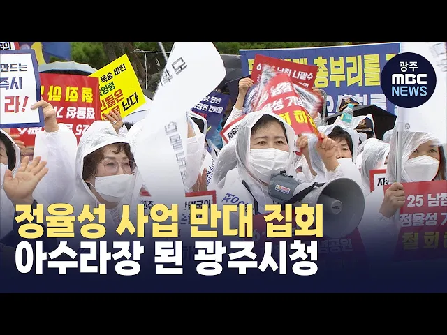 (앵커) 정율성 공원 사업을 반대하는 보수단체와 보훈단체들이 오늘(30) 광주시청에서 대규모 집회를 열었는데 이 과정에서 몸싸움도 일어났습니다. 광주시는 한중우호사업인 정율성 사업을 책임지고 잘 진행하겠다는 입장을 내놨습니다. 임지은 기자가 보도합니다. (기자) 비가 오는 궂은 날씨에도 보훈단체 회원들이 광주...