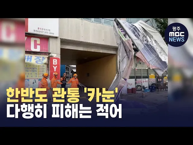 (앵커) 태풍 카눈은 북상 전부터 유례없이 한반도를 관통할 것으로 예상돼 긴장감이 높아졌었는데요. 카눈은 작은 생채기는 남긴 했지만 다행히 큰 피해 없이 지나갔습니다. 천홍희 기자가 보도합니다. (기자) 형체를 알아 볼 수 없게 찢기 간판을 처리하기 위해 소방대원들이 분주하게 움직합니다. 바람에 더 이상 휘날리...