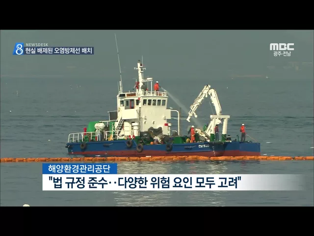◀ANC▶ 해양 유류 오염사고에 대비한 방제선이 지역별로 효율적으로 배치되지 않고 있습니다. 여수와 목포지역의 방제선 척수가 다른지역에 비해 턱없이 열악하는 지적이 나왔습니다. 박광수 기자가 보도합니다. ◀END▶ 지난 2014년 800kl의 기름을 바다에 유출시켰던 여수 우이산호 송유관 충돌 사고. 전국 주요항만의...