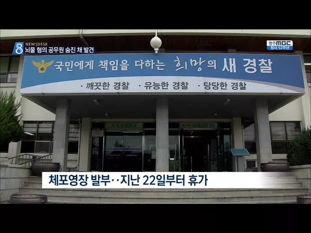 ◀ANC▶ 뇌물수수 혐의로 경찰 조사를 받던 순천시 공무원이 숨진 채 발견됐습니다. 혐의가 구체화돼 체포영장이 발부된 상태에서 스스로 목숨을 끊은 것으로 보입니다. 보도에 문형철 기자입니다. ◀VCR▶ 순천의 모 산장 인근 공터입니다. 오늘(26) 오전 11시쯤 순천시청 6급 공무원 55살 김 모 씨가 나무가지에 목을 ...
