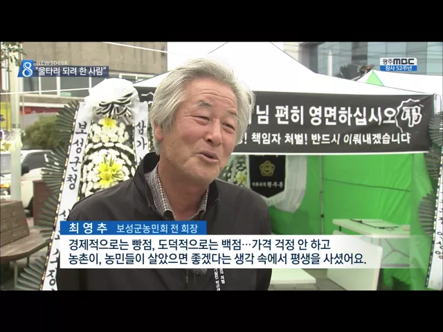 ◀ANC▶ 경찰이 쏜 물대포에 맞아 의식불명에 빠졌던 백남기 농민이 끝내 숨지며 국가폭력 논란을 둘러싼 사회적 파장이 점차 확산되고 있습니다. 서울에서는 갈등과 대치가 이어지는 가운데 그의 고향인 보성에서는 친구와 이웃들이 깊은 슬픔에 잠겨있습니다. 김인정 기자입니다. ◀VCR▶ 보성역 앞에 꾸려진 단촐한 분...