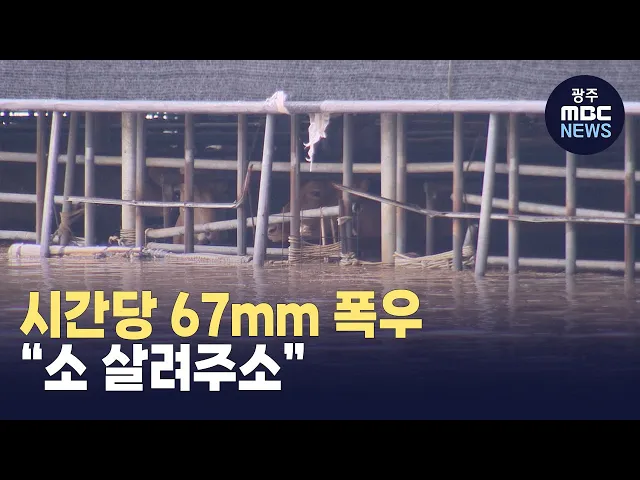 (앵커) 함평에서는 오늘 새벽 시간당 67mm의 폭우가 쏟아졌습니다. 절개지가 무너지고 축대가 붕괴됐는데 축사가 물에 잠기면서 주민들은 망연자실했습니다. 이어서 서일영 기자가 취재했습니다. (기자) 축사 지붕 바로 밑까지 물에 잠겼습니다. 축사 안에 있는 소들은 머리만 내놓고 꼼짝없이 갇혀 버렸습니다. 오늘 새벽 ...