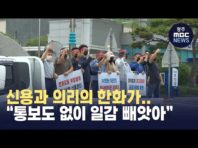 (앵커) 수십년동안 한화와 거래해온 지역의 한화 대리점들이 하루 아침에 일감을 잃었다며 시위에 나섰습니다. 대기업이 말도 없이 일감을 가로챘다는 건데, 한화 측은 대리점들이 화약 가격을 높여서 받고 있다는 항의가 수차례 접수돼 어쩔 수 없었다고 맞서고 있습니다. 천홍희 기자가 취재했습니다. (기자) 빨간 머리띠...