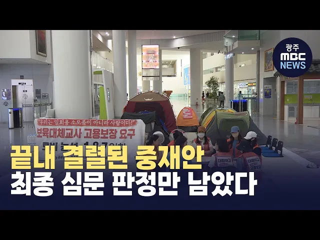 (앵커) 광주 지역 보육 대체교사들이 고용보장을 요구하며 7개월 가까이 시청사 점거농성을 벌이고 있죠. 노동 분야에서는 사실상 최종심에 해당하는 중앙노동위원회가 중재안을 내놓았는데 노조가 이를 받아들이지 않았습니다. 오는 27일로 예정된 중노위의 최종 판정에 이목이 쏠립니다. 주현정기자가 보도합니다. (기자)...