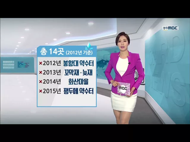 때이른 초여름 더위가 계속되고 있는데요, 무등산을 오를 때 '약수터'에서 목을 축이시는 분들 많으시죠. 그런데 광주에 있는 약수터 세 곳 가운데 한 곳이 수질 악화로 폐쇄된 사실 알고 계십니까? 2012년까지만 해도 광주에는 총 14곳의 약수터가 있었는데요. 봉황대 약수터를 시작으로, 꼬막재와 늦재, 화산마을 약수터,...