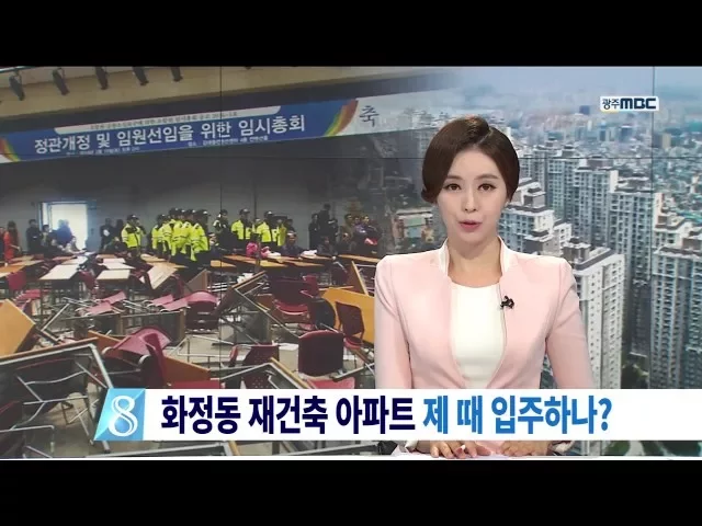(앵커) 광주 화정동 유대회 선수촌 입주민들이 다음달 입주를 앞두고 충돌하고 있습니다. 가구당 많게는 1천 5백만원을 더 내야 입주를 할 수 있기 때문인데요... 입주가 정상적으로 될지 우려됩니다. 송정근 기자입니다. (기자) 의자와 책상은 어지럽게 널부러져 있고.. 한 여성은 단상에 고춧가루를 뿌립니다.. 화정동 선...