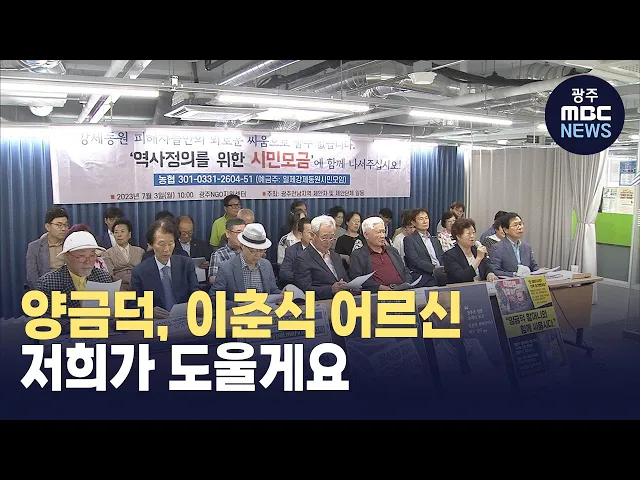 (앵커) 정부의 강제동원 해법인 제3자 변제방식을 거부하고 있는 피해자들을 돕기 위해 시민들이 뭉쳤습니다. 외로운 싸움을 피해자 혼자하게 둘 수 없고, 역사정의를 세우기 위해 시민모금에 들어간 건데요. 목표액은 광복절 즈음까지 10억원을 목표로 하고 있습니다. 송정근 기자입니다. (기자) 한 눈에 봐도 많이 야윈 ...