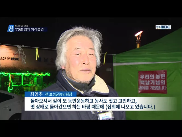 (앵커)우리 지역 농민 백남기씨가 경찰의 물대포에 맞아 쓰러진 지도 두 달이 넘었습니다. 가족과 고향사람들이 백씨의 쾌유를 바라는 집회를 매일 열고 있지만 백씨의 상태는 악화되고 있습니다. 김철원 기자입니다. (기자) 보성역에서는 매일같이 집회가 열리고 있습니다. 지난해 11월 14일 서울서 열린 민중총궐기 때 ...