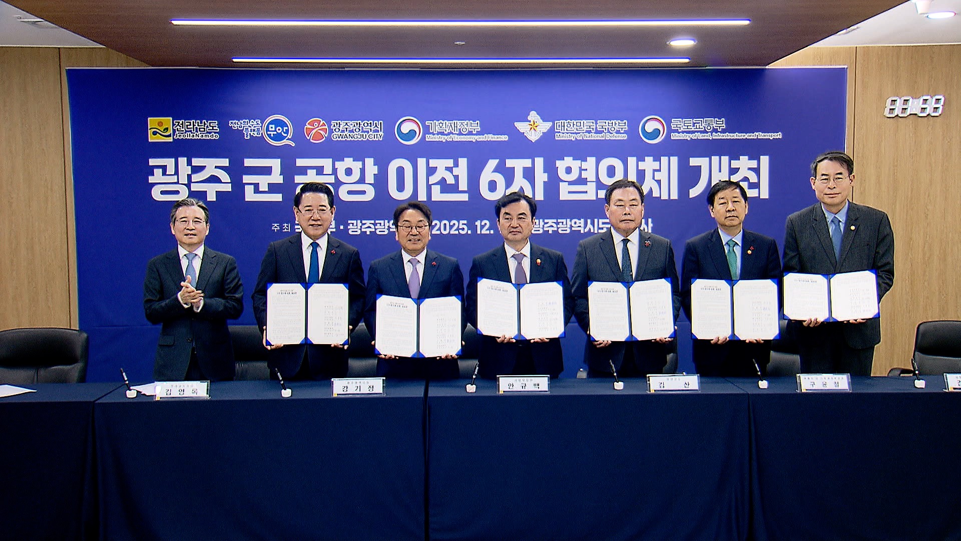 광주 민간·군공항의 무안 통합이전이 마침내 타결됐습니다.김용범 대통령실 정책실장은 오늘(17) 광주도시공사에서 열린 광주 군 공항 이전 6자 협의체 회의를 마친 뒤"광주 군 공항 이전 사업에 대해 드디어 합의를 이뤘다"고 밝혔습니다.이로써 광주와 전남의 최대 현안이었던광주 군 공항 이전 사업이 20년만에 종지부를...
