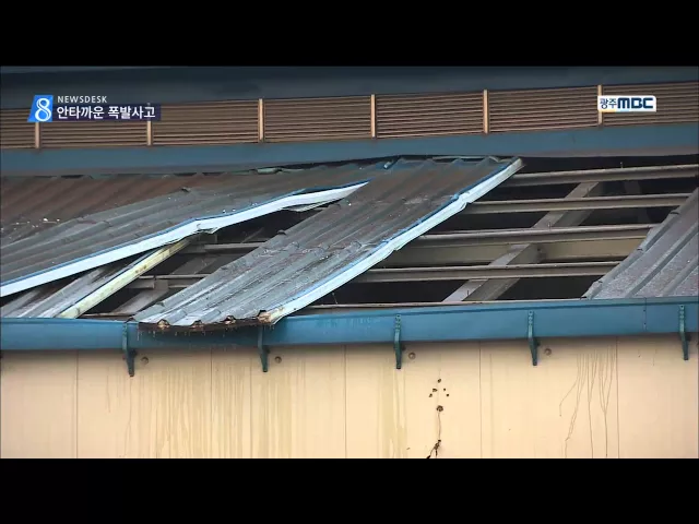◀ANC▶ 세밑에 일어난 안타까운 사고 소식입니다. 영암 대불산단의 한 공장에서 폭발 사고가 발생해 1명이 숨지고, 1명이 다쳤습니다. 양현승 기자입니다. ◀END▶ ◀VCR▶ 공장 지붕에 구멍이 뚫렸고, 대형 철제 문이 뜯어졌습니다. 오늘 오전 10시 55분쯤, 섬유 염료를 만드는 영암 대불산단의 한 공장에서 탱크가 폭...