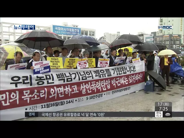 (앵커) 경찰의 물대포에 맞은 보성의 농민이 아직도 의식을 회복하지 못하고 사경을 헤매고 있습니다. 어제 이를 규탄하는 목소리가 잇따랐는데, 경찰이 규정을 위반해 물대포를 쐈다는 겁니다. 정용욱 기자입니다. (기자) 경찰이 쏜 물대포에 맞아 보성 농민 68살 백남기 씨가 1-2미터 가량 뒤로 나가 떨어집니다. 쓰러진 ...