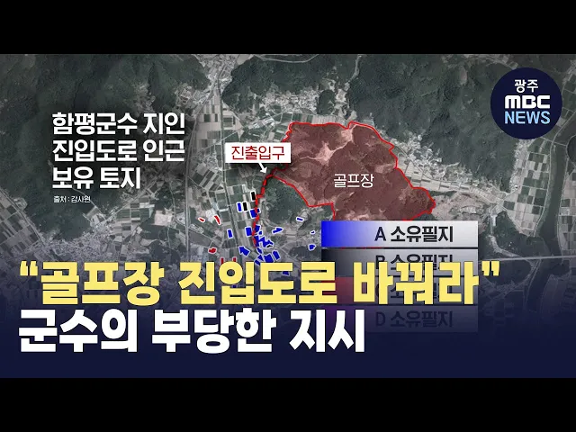 (앵커) 함평의 한 골프장 조성 공사 과정에서 함평군수가 골프장 진입로 위치를 갑자기 변경하라는 지시를 했던 사실이 감사원 감사에서 드러났습니다. 진입도로는 이후 변경되지는 않았지만 감사원은 행위 자체부터 문제가 있었다고 보고 주의를 촉구했습니다. 박종호 기자가 취재했습니다. (기자) 올해 4월 문을 연 함평...
