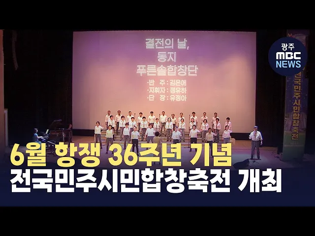 6.10항쟁 36주년을 기념하는 제7회 전국민주시민합창축전이 오늘 오후 4시 광주교대에서 개최됐습니다. '평화와 희망의 하모니 in 광주'라는 주제로 열린 이번 합창축전에는 전국에서 14개 합창단이 참여해 지역의 역사적인 운동과 아픔을 노래로 승화시켰습니다. 전국 광역시도를 순회하며 개최되고 있는 합창축전은 지난...