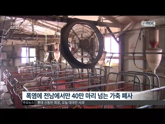 ◀앵 커▶ 열흘 넘게 폭염이 계속되면서 더위에 약한 가축들의 폐사가 늘고 있습니다. 시장 가격이 좋지 않아 출하까지 늦어지면서 축산농민들이 이중고를 겪고 있습니다. 김양훈 기자가 취재했습니다. 더위에 지친 닭들이 축사에 힘없이 앉아 있습니다. 연일 계속되고 있는 폭염에 닭들이 맥을 못추고 있습니다. 축사 위에 ...