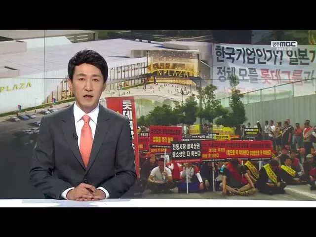 ◀앵 커▶ 대형유통업체가 들어서려고 하면 어디서나 중소상인들의 반발이 있는데 롯데의 경우는 사정이 더 복잡해지게 됐습니다. 최근 국적 논란까지 겹치면서 반발이 더 커졌습니다. 신광하 기자입니다. 남악대형쇼핑몰 입점을 반대하는 시민들이 롯데카드를 자르는 퍼포먼스를 진행하고 있습니다. 롯데 제품 불매운동을 선...