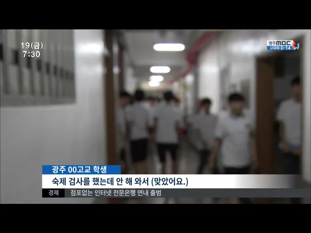(앵커) 학교 교육현장에서 아직도 체벌 관행이 사라지지 않고 있습니다. 숙제를 하지 않았다는 이유로 고등학교 수학교사가 학생들을 수십대씩 때려 물의를 빚고있습니다. 이계상 기자.. (기자) 광주시내 한 고등학교 1학년 학생의 엉덩이 사진입니다. 시퍼렇게 멍이 들어 상당히 오래 갈 수 밖에 없는 상탭니다. 이렇게 매...