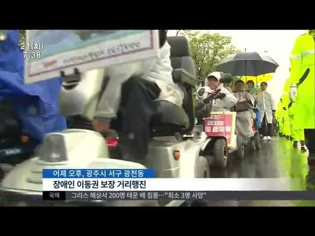 (앵커) 장애인들은 대중 교통을 이용하기가 참 힘든데 이걸 좀 개선해달라고 요구해도 좀처럼 고쳐지지 않고 있습니다. 답답한 장애인들이 거리로 나왔습니다. 송정근 기자입니다. (기자) 비가 오는 궂은 날씨 속에서 장애인들이 거리를 행진합니다. 손에는 '이동권 확보가 곧 생존이다' '우리도 대중교통을 이용하고 싶다'...