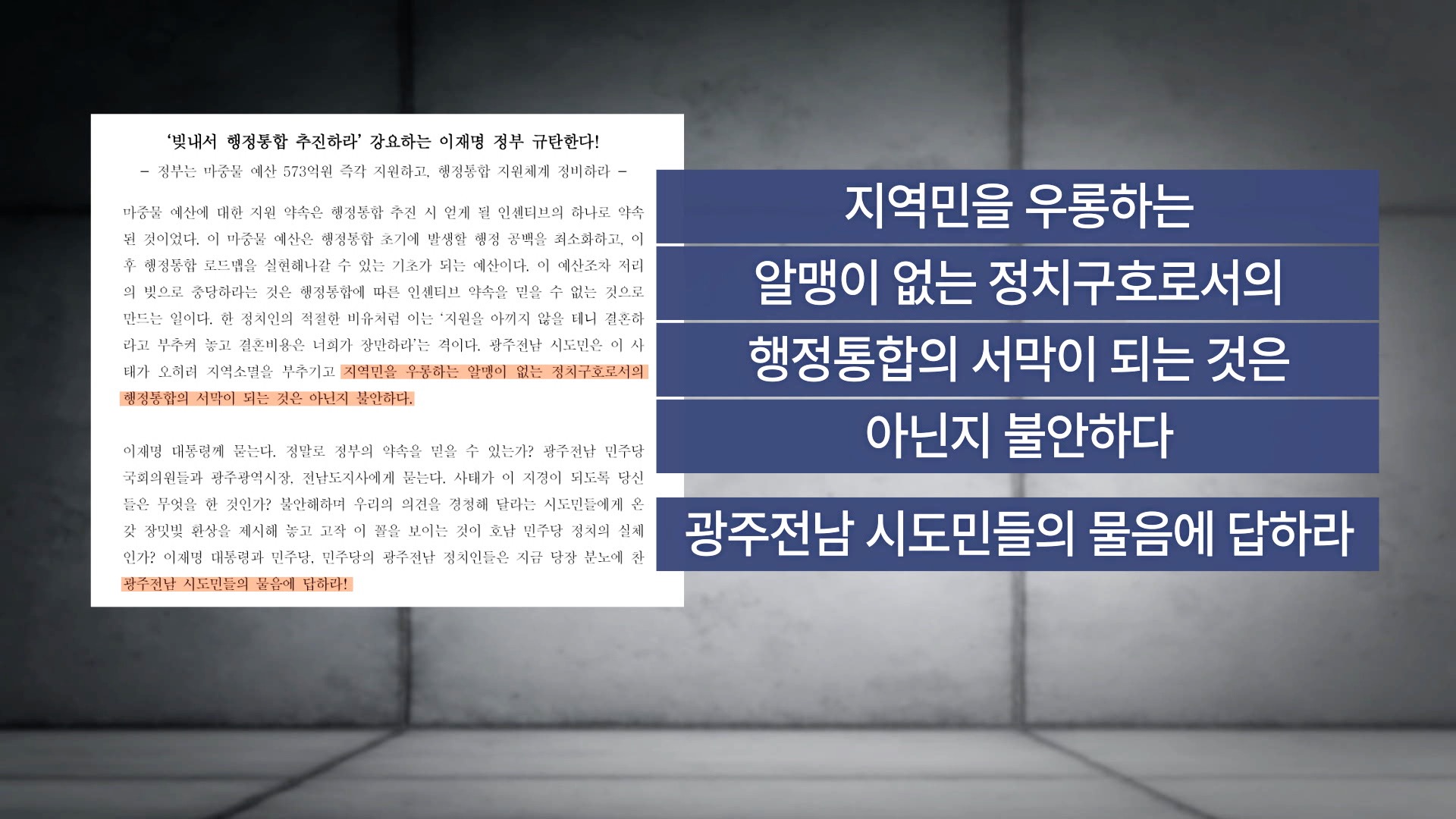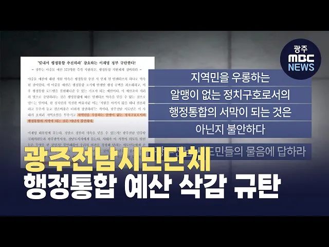 광주전남시민단체들이 정부의 행정통합 마중물 예산 573억원이 전액 삭감된 것을 규탄하며, "초기 비용을 지자체에 떠넘기지 말고 즉각 지원하라"고 촉구했습니다.이들은 성명을 통해 "이재명 대통령의 '특별한 대가' 약속을 믿었지만, 결과는 배신이었다"며, "행정통합이 알맹이 없는 정치 구호로 전락했다"고 비판했습니...